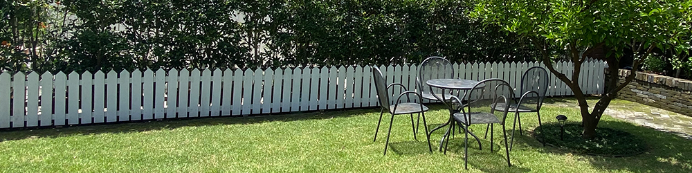 Inside the Jeju stone wall, a camellia fence blends in with the lawn.